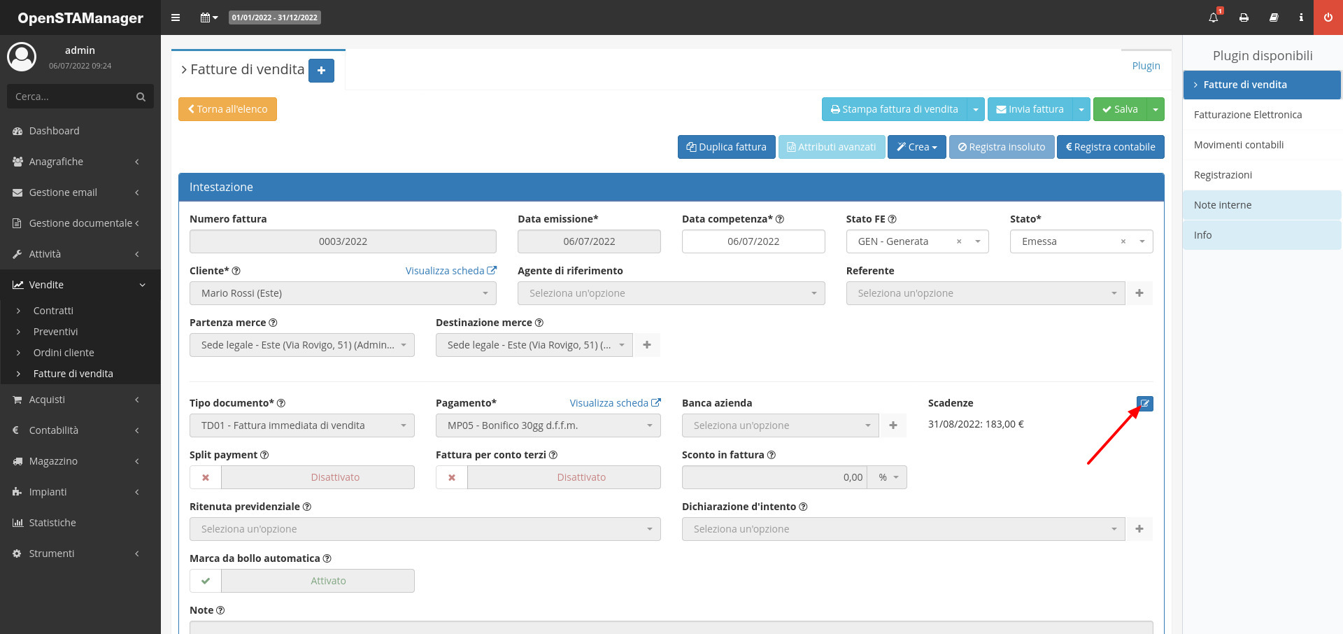 All'atto dell'emissione di una fattura infatti si potrà notare che il gestionale aprirà una scadenza in scadenzario, visualizzabile dalla schermata di dettaglio della fattura sotto la voce Scadenzario.