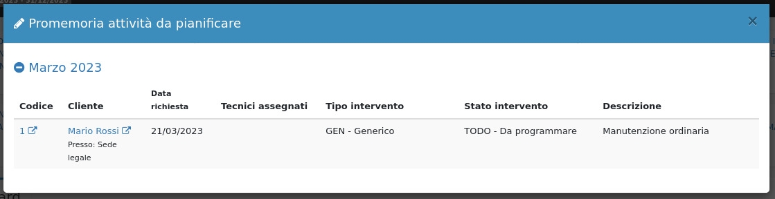 Grazie al calendario questo modulo offre una visione generale degli Interventi, a cui è possibile applicare dei filtri.