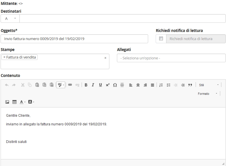 Viene inoltre fornita la possibilità, oltre di impostare manualmente i destinatari, di allegare alcuni upload dell'anagrafica Azienda predefinita e dell'elemento di cui si sta effettuando la condivisione.