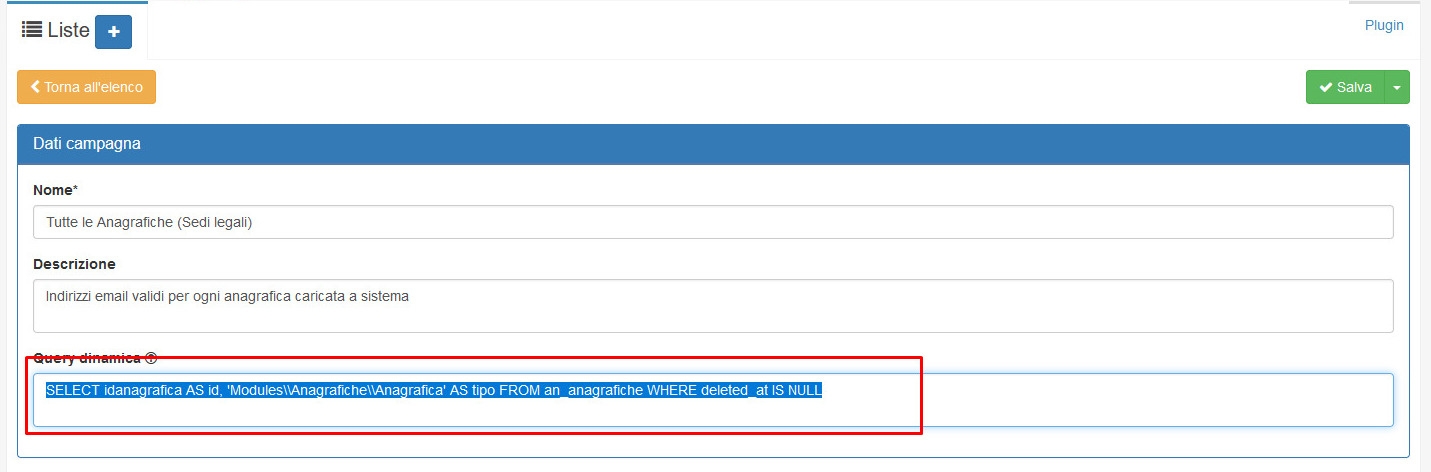 Query dinamica: L'utilizzo di questo campo esclude la possibilità di inserire i destinatari tramite il menù a tendina "Destinatari" presente nella sezione Aggiunta destinatari. Le informazioni inserite in questo campo devono essere scritte con il linguaggio sql; Esempio: "SELECT idanagrafica AS id, 'Modules\Anagrafiche\Anagrafica' AS tipo FROM an_anagrafiche WHERE deleted_at IS NULL" aggiungerà tutte le anagrafiche nella tabella Destinatari.