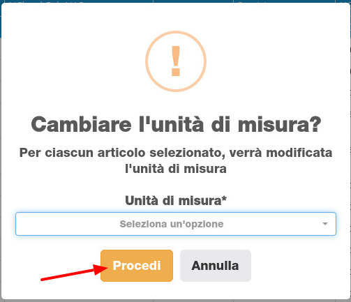 Il gestionale chiederà quindi l'unità di misura da applicare agli articoli.