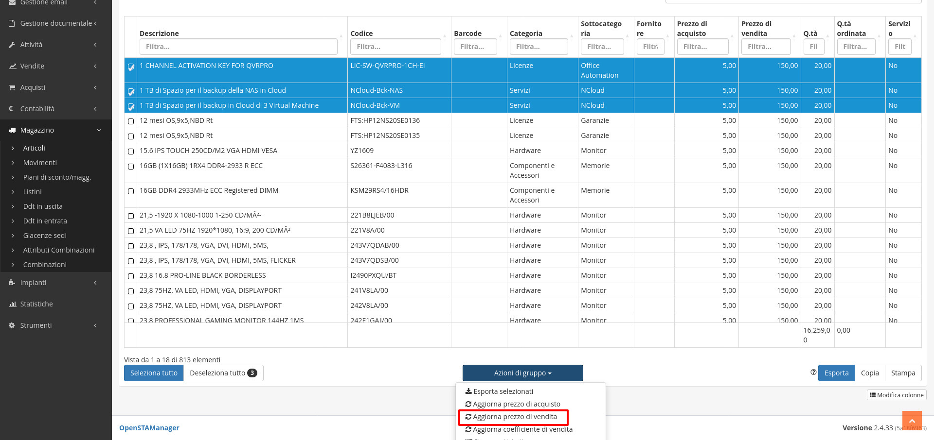Una volta selezionati i record interessati è possibile modificarne massivamente il prezzo di vendita cliccando su Azioni di gruppo/Aggiorna prezzo di vendita.
