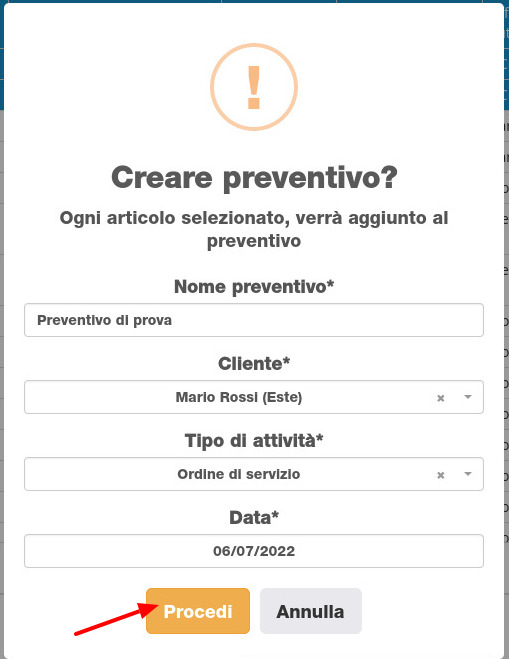 Il gestionale chiederà ora il nome del preventivo, il cliente, il tipo di attività e la data.