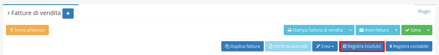 Dalla schermata di dettaglio di una fattura di vendita è possibile procedere alla sua registrazione come insoluto cliccando su Registra insoluto.