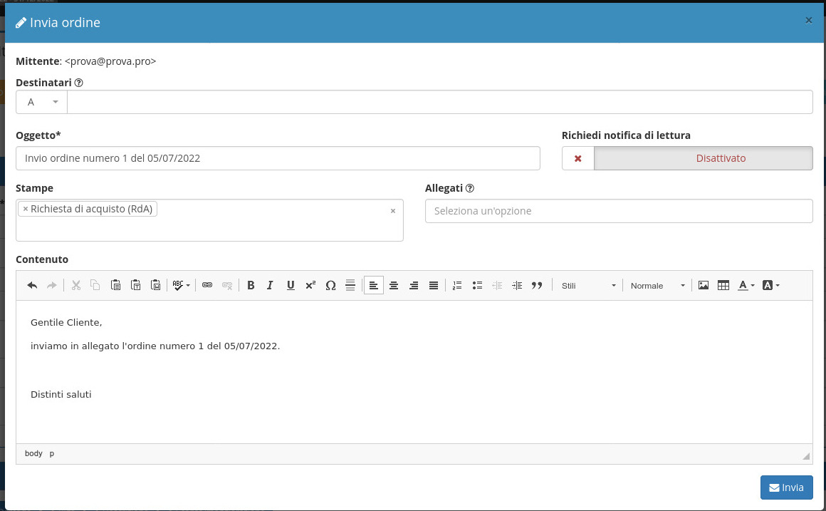 Cliccando su Invia ordine si verrà indirizzati al template email compilato con i dati dell'ordine fornitore, dove sarà possibile inviare la mail cliccando su invia.