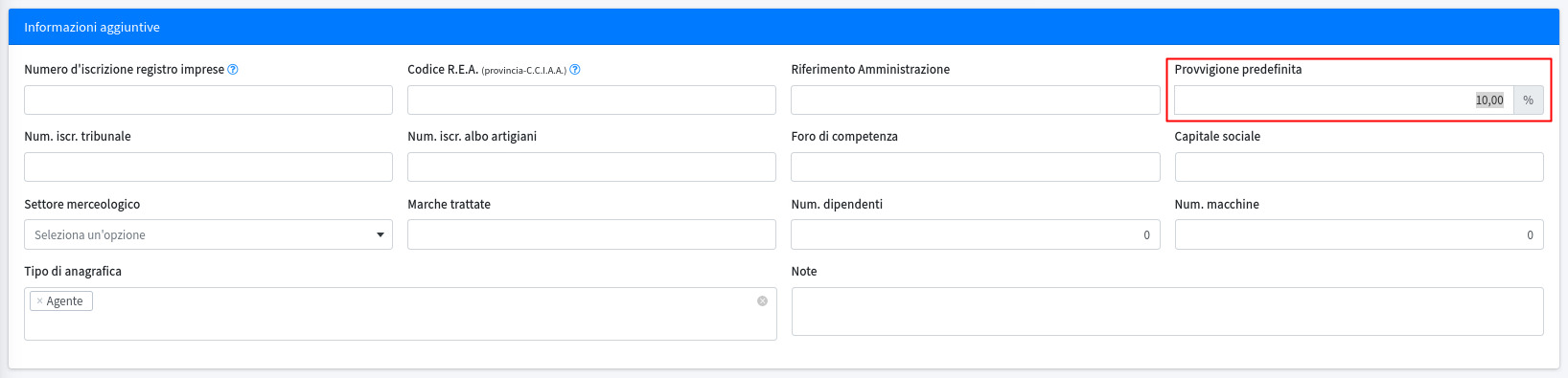 • Provvigione predefinita (nel caso di anagrafica del tipo Agente)