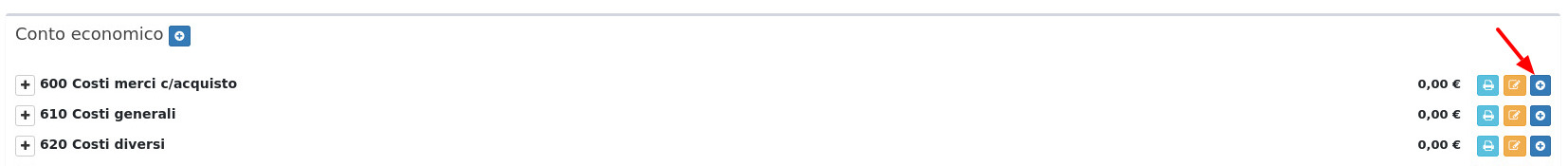 Per creare un nuovo conto si dovrà cliccare sul tasto (+) corrispondente alla voce sotto la quale si vorrà inserire: