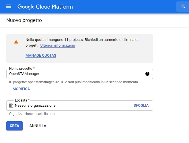 Una volta raggiunta la Google Cloud Platform, si deve procedere a generare un Nuovo progetto appositamente denominato "OpenSTAManager"; in alternativa, se รจ disponibile un progetto pre-esistente, รจ possibile utilizzarlo.
