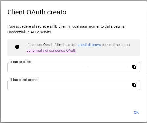 Una volta compilate le informazioni richieste, comparirร una schermata che riferisce Client ID e Secret: รจ necessario copiare i contenuti indicati nei rispettivi campi del modulo Account email.