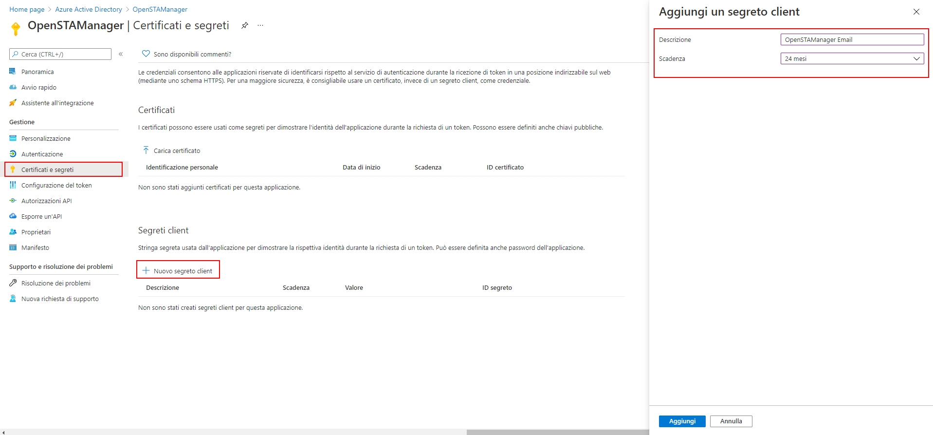 Una volta completato questo passaggio, viene reso disponibile il Client ID sotto il nome di ID applicazione (client). La generazione del Client Secret avviene attraverso il menu laterale Certificati e segreti, che propone la creazione del segreto tramite il pulsante Nuovo segreto client: il Client Secret รจ quindi disponibile sotto il nome Valore del nuovo segreto.