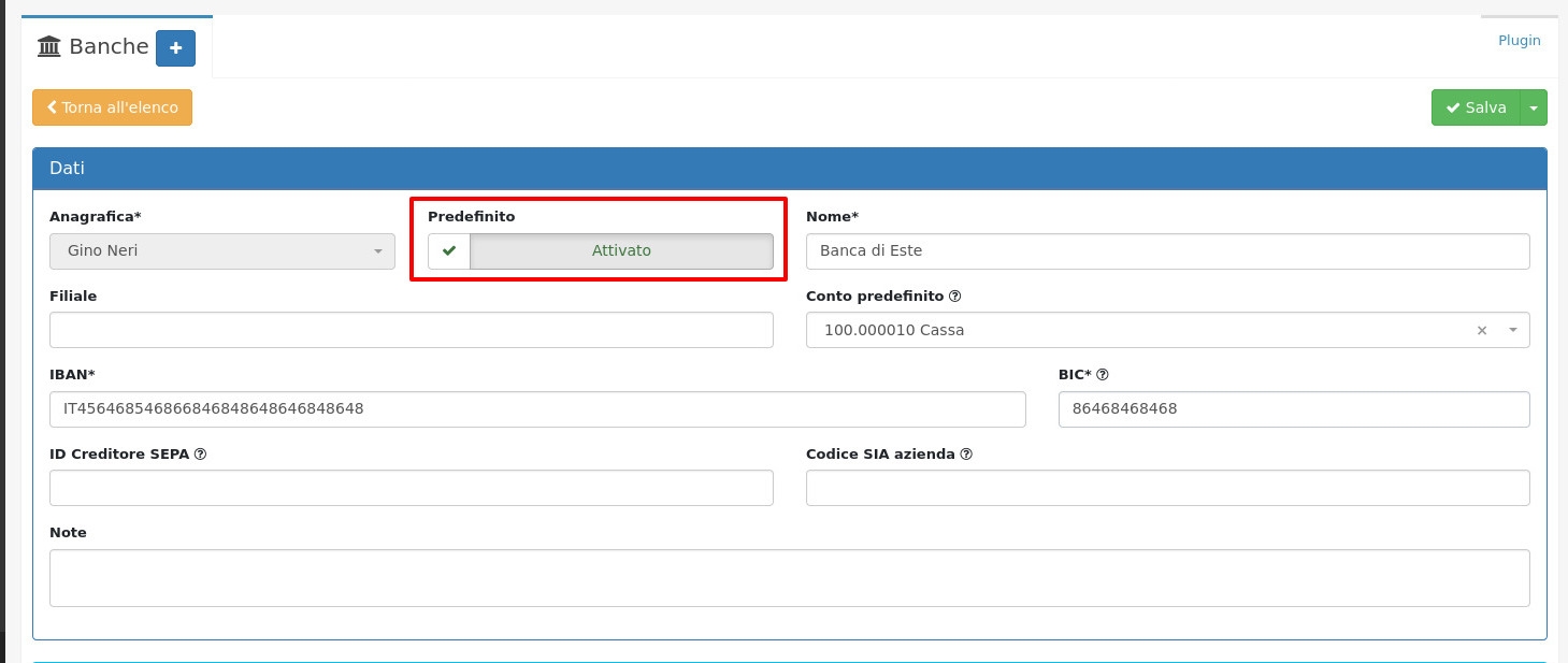 Dalla schermata successiva si dovrà procedere a impostare la banca come predefinita tramite l'apposita selezione.
