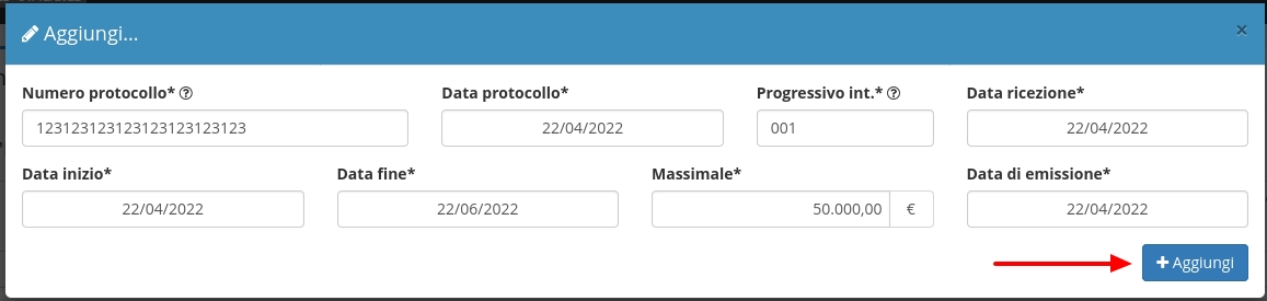 Cliccando sul tasto (+), si avrà quindi accesso al form dove inserire i dati relativi alla Dichiarazione d'intento da aggiungere.