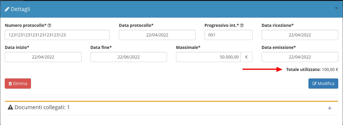 E' possibile inoltre verificare il Totale utilizzato aprendo una specifica Dichiarazione d'intento da Anagrafiche/Dichiarazioni d'Intento.
