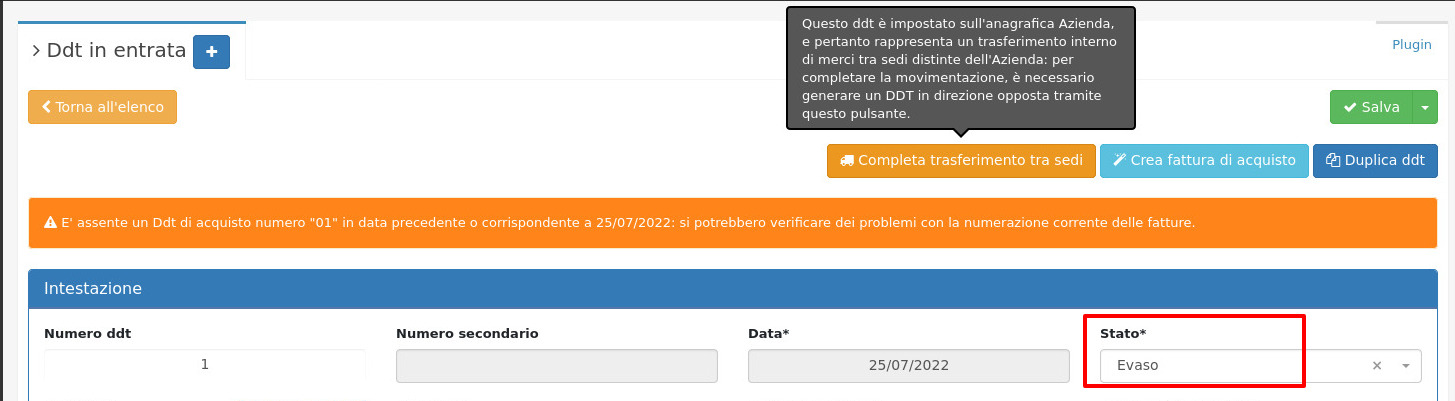 Una volta effettuato il trasferimento e impostato il DDT come evaso, si dovrà andare a registrare lo stesso DDT con direzione opposta. Sarà possibile registrare questo DDT direttamente da questa schermata cliccando sul tasto Completa trasferimento tra sedi.