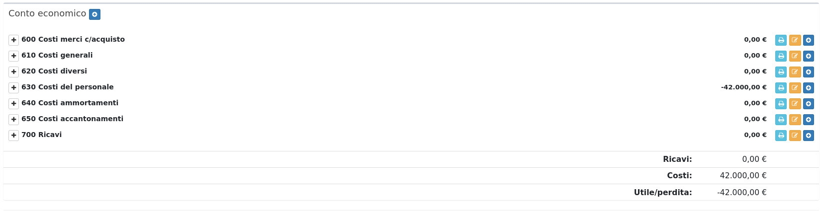 Per creare nuove voci nel piano dei conti è necessario cliccare sul tasto corrispondente alla riga dove andare a inserire il nuovo conto: