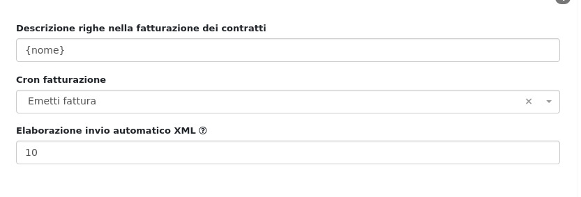 Cron fatturazione: E' qui possibile scegliere gli automatismi da eseguire, scegliendo tra: emissione della fattura, emissione della fattura e invio di copia di cortesia via email, ed emissione della fattura, invio di copia di cortesia via email e invio dell'xml allo SDI.