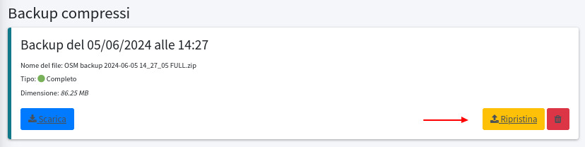 Esiste una procedura semplificata di ripristino dei backup, che cerca di risolvere il problema tecnico per utenti con meno esperienza tecnica. Si dovrà cliccare Ripristina nel backup interessato, dalla sezione Backup compressi.