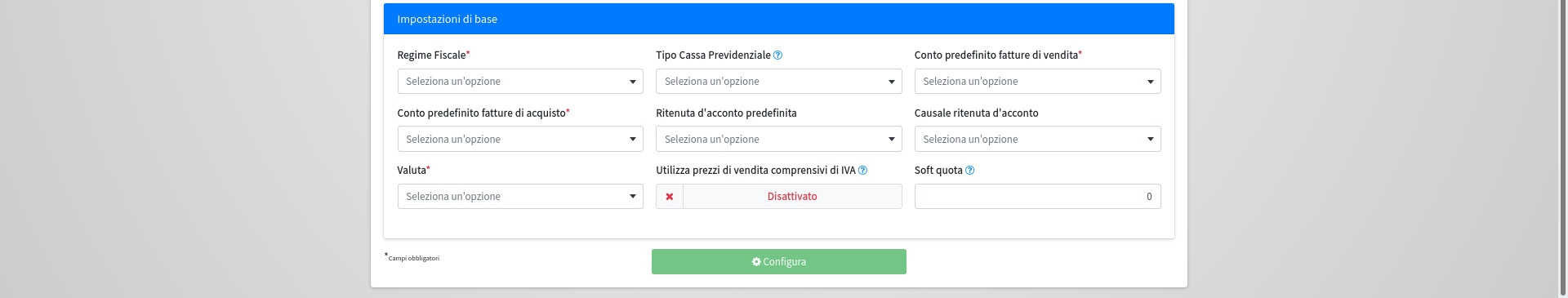 Andranno qui immesse le informazioni base dell'azienda per effettuare il primo accesso, suddivise in: