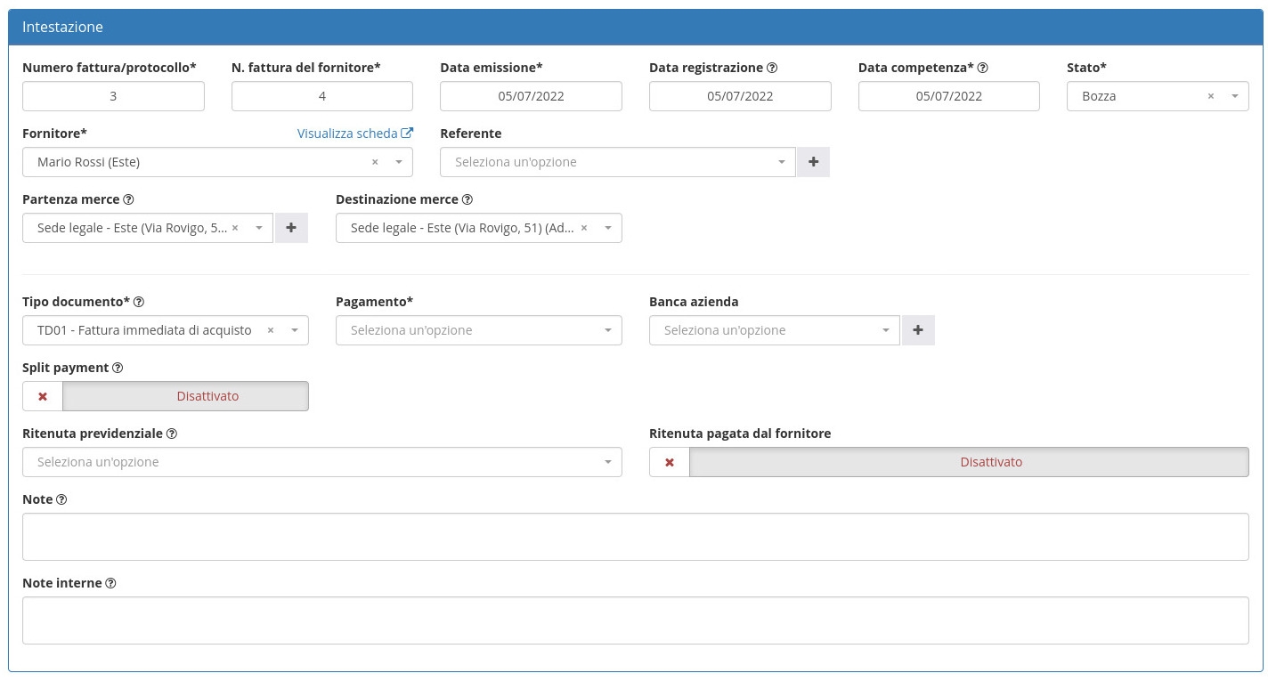 Andranno qui inserite le informazioni relative alla nuova fattura di acquisto: