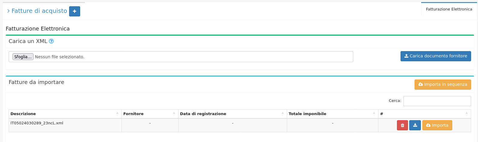 E' inoltre possibile caricare l'XML di una fattura di acquisto dalla sezione Carica un XML.