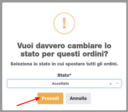 Il gestionale chiederà quindi la conferma a procedere alla modifica dello stato, permettendo di scegliere tra gli stati presenti:
