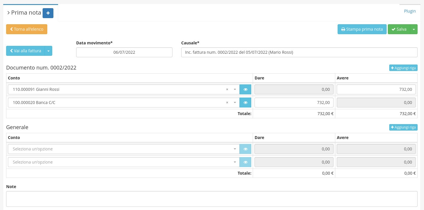 Dal modulo Prima nota sarà ora possibile visualizzare il movimento appena registrato, e dalla fattura di vendita si potrà notare che la scadenza creatasi all'emissione della fattura è stata chiusa.