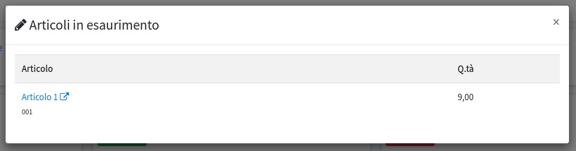 Il widget elenca gli articoli e le loro quantità disponibili, in base alla soglia minima impostata all'interno della scheda di ciascun articolo: