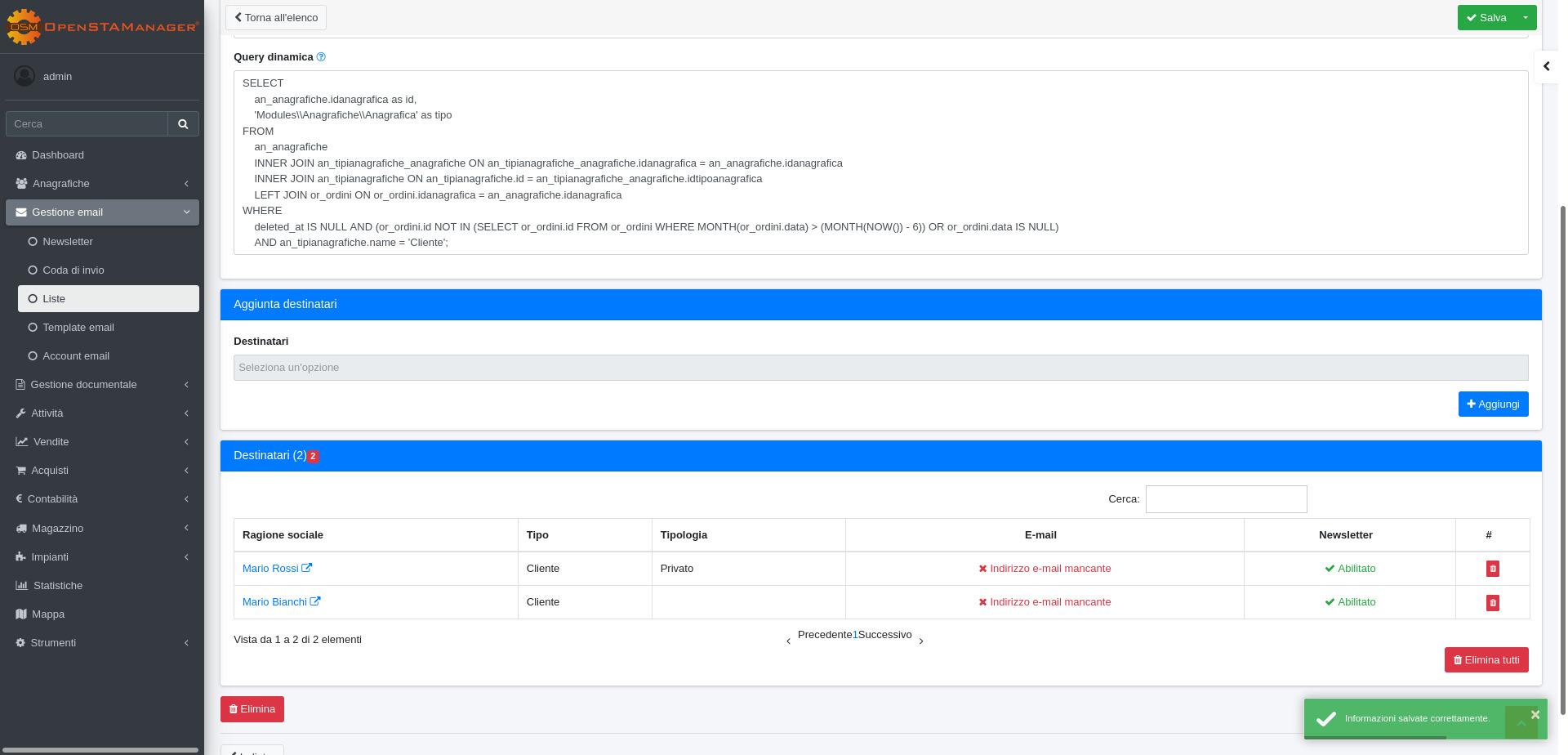 Query dinamica: L'utilizzo di questo campo esclude la possibilità di inserire i destinatari tramite il menù a tendina "Destinatari" presente nella sezione Aggiunta destinatari. Le informazioni inserite in questo campo devono essere scritte con il linguaggio sql; Esempio: "SELECT idanagrafica AS id, 'Modules\Anagrafiche\Anagrafica' AS tipo FROM an_anagrafiche WHERE deleted_at IS NULL" aggiungerà tutte le anagrafiche nella tabella Destinatari.