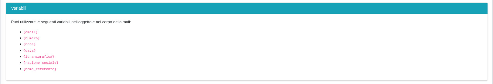 Tra questi campi, Contenuto e Oggetto prevedono un sistema di autocompletamento per alcuni particolari valori definiti dal modulo. L'elenco completo di questi elementi viene reso disponibile nella sezione informativa Variabili.