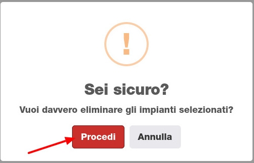 Il modulo Impianti permette l'Esportazione e l'Eliminazione massiva tramite le Azioni di gruppo.