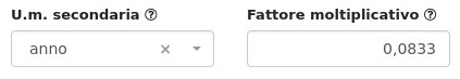 Esempio 2: Nel caso di acquisto di licenze mensili e rivendita annualmente, si dovrà impostare come unità di misura primaria il mese e secondaria l'anno, con relativo fattore moltiplicativo.