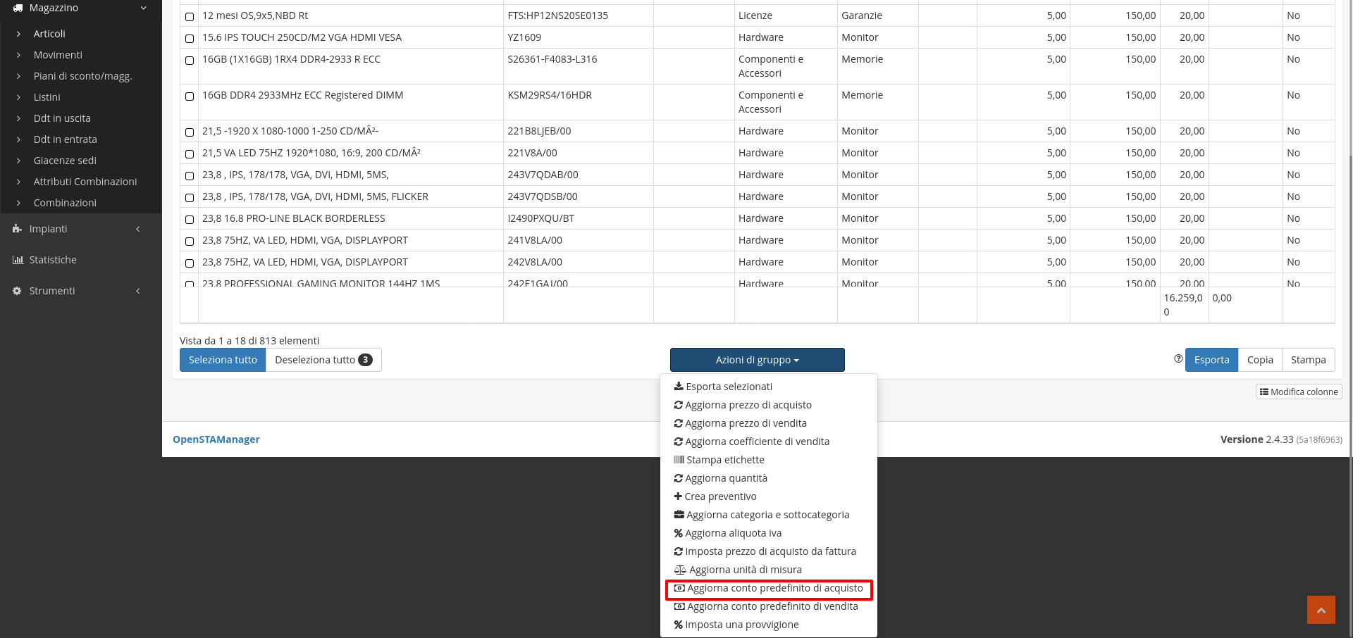 Il modulo Articoli permette di svolgere diverse azioni massivamente dalle azioni di gruppo: