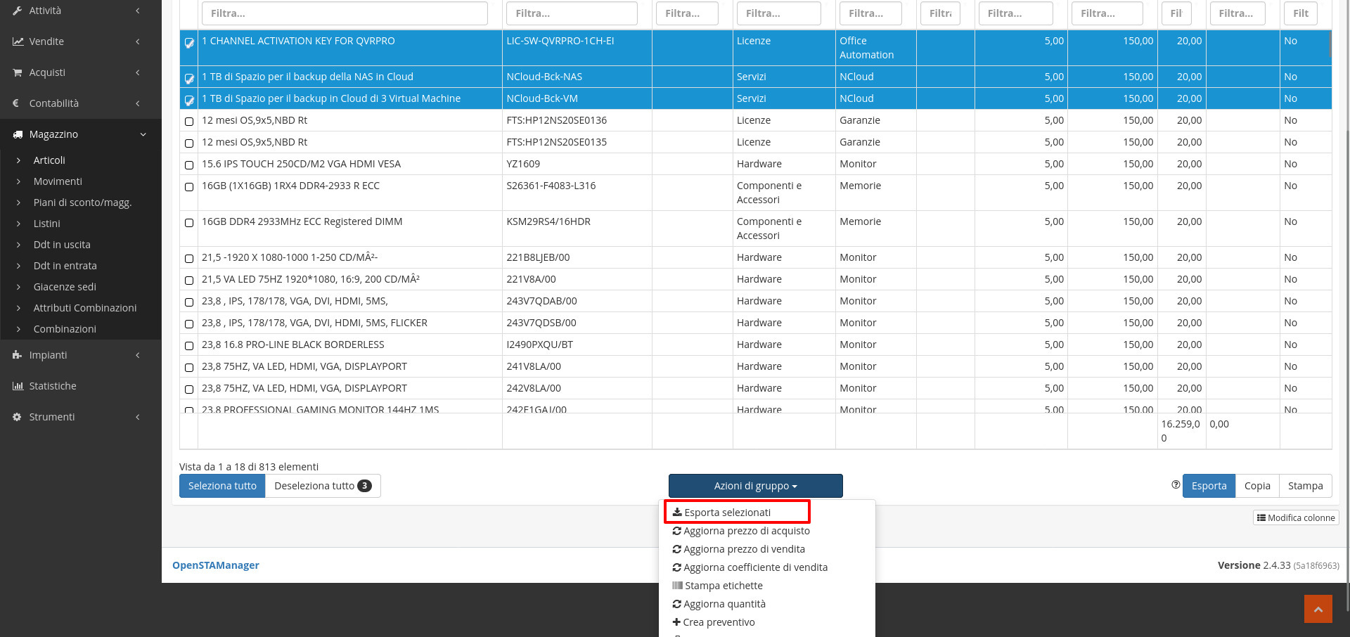 Una volta selezionati i record interessati è possibile esportare massivamente gli articoli cliccando su Azioni di gruppo/Esporta selezionati.