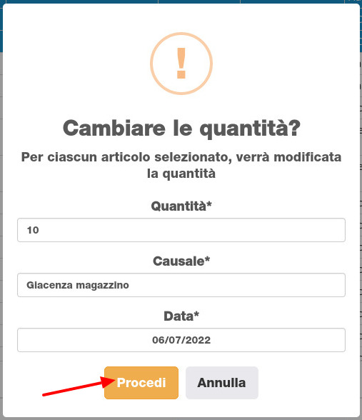 Il gestionale chiederà ora la quantità da aggiornare, la Causale per movimentare il magazzino, e la Data.