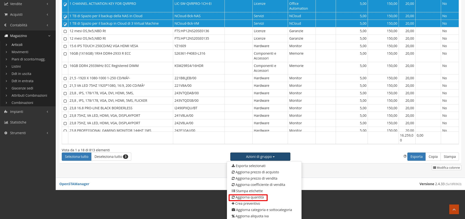 Una volta selezionati i record interessati è possibile aggiornare massivamente le loro quantità cliccando su Azioni di gruppo/Aggiorna quantità