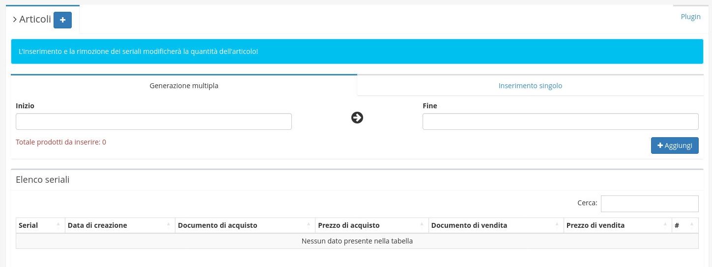 Permette l'inserimento di nuovi prodotti numerati grazie alla possibilità di andare ad indicare un Serial number di un determinato range o anche singolo.
