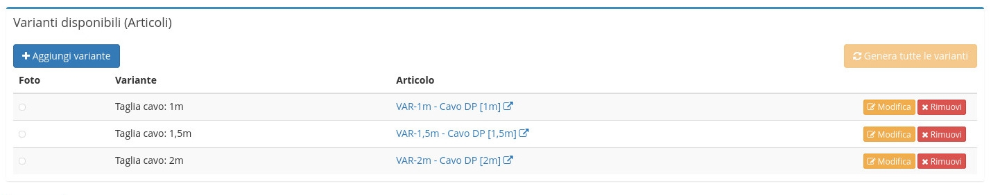 Cliccando su Aggiungi variante invece, sarà possibile associare a ogni valore un articolo esistente dal magazzino.