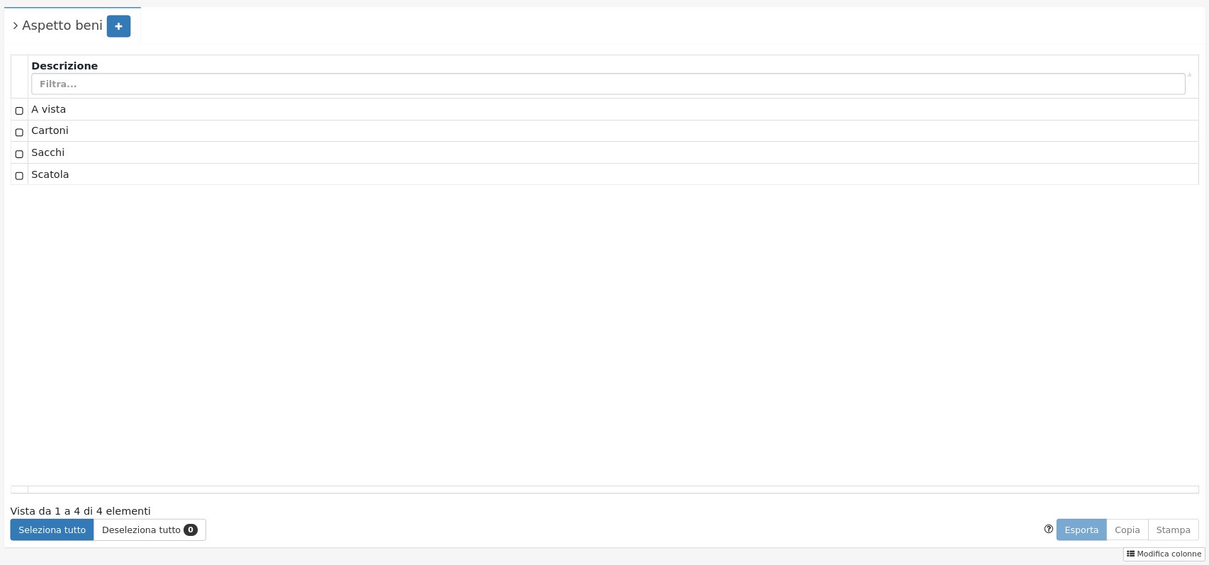 Cliccando sul record da modificare si aprirà la schermata di dettaglio, da cui sarà possibile modificare la descrizione dell'aspetto beni selezionato.