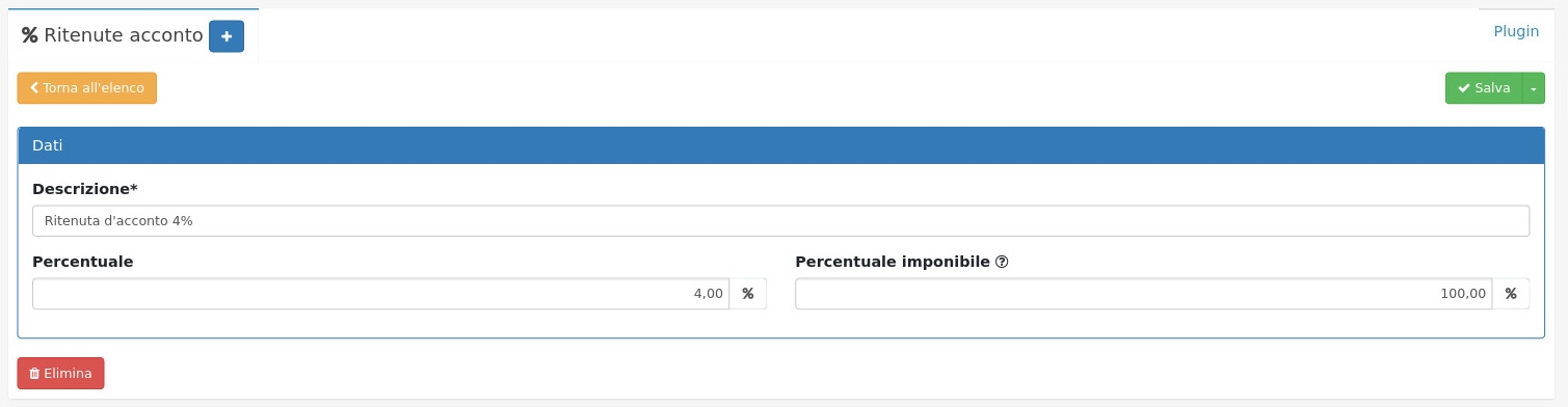 Per creare una nuova ritenuta d'acconto si dovrà cliccare sul tasto (+).