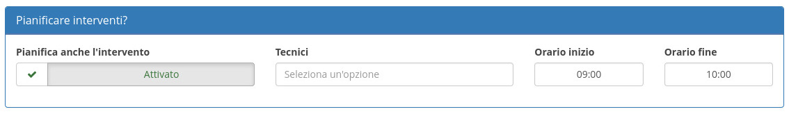 Per poter correttamente creare le sessioni di lavoro e visualizzare le attività pianificate in Dashboard, è necessario che il campo Tecnici sia valorizzato.