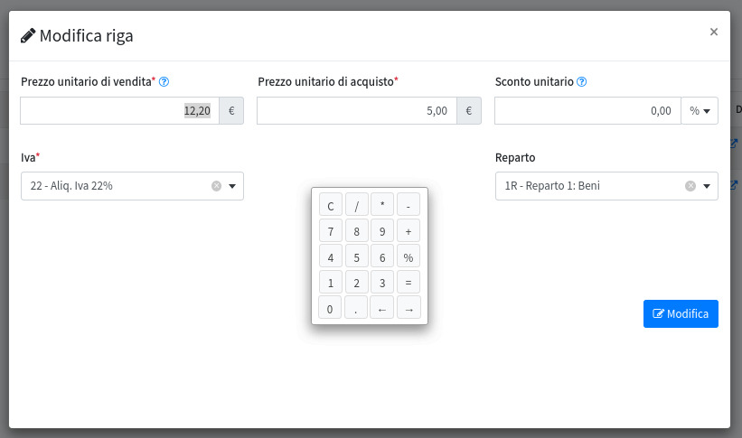 Cliccando su modifica riga si accederà alla seguente schermata, dove sarà possibile applicare uno sconto, cambiare l'aliquota IVA, il prezzo di acquisto e di vendita.