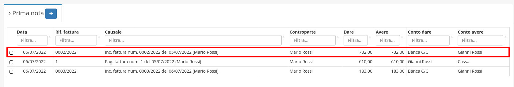 Dal modulo Prima nota sarà ora possibile visualizzare il movimento appena registrato, e dalla fattura di vendita si potrà notare che la scadenza creatasi all'emissione della fattura è stata chiusa.
