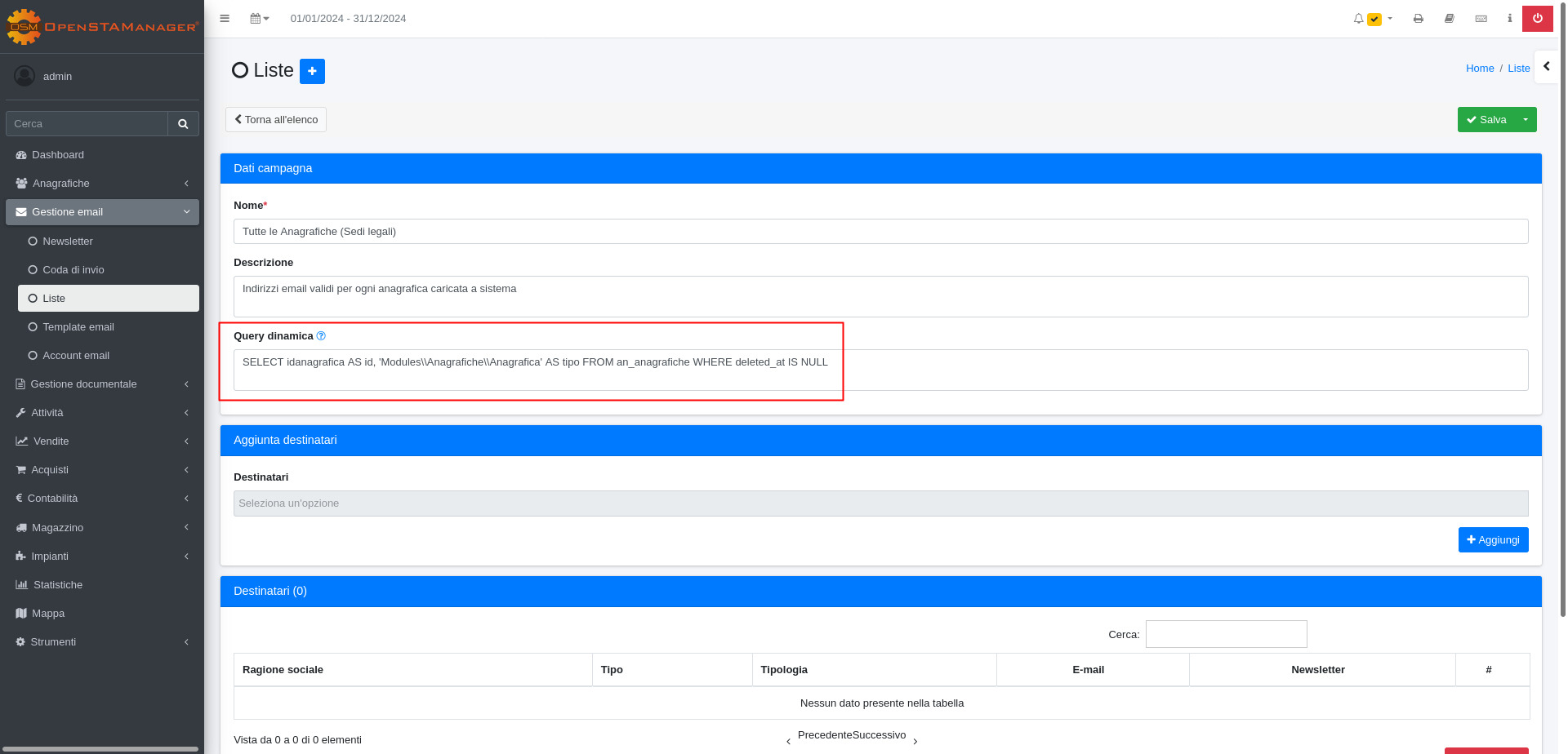 Query dinamica: L'utilizzo di questo campo esclude la possibilità di inserire i destinatari tramite il menù a tendina "Destinatari" presente nella sezione Aggiunta destinatari. Le informazioni inserite in questo campo devono essere scritte con il linguaggio sql; Esempio: "SELECT idanagrafica AS id, 'Modules\Anagrafiche\Anagrafica' AS tipo FROM an_anagrafiche WHERE deleted_at IS NULL" aggiungerà tutte le anagrafiche nella tabella Destinatari.