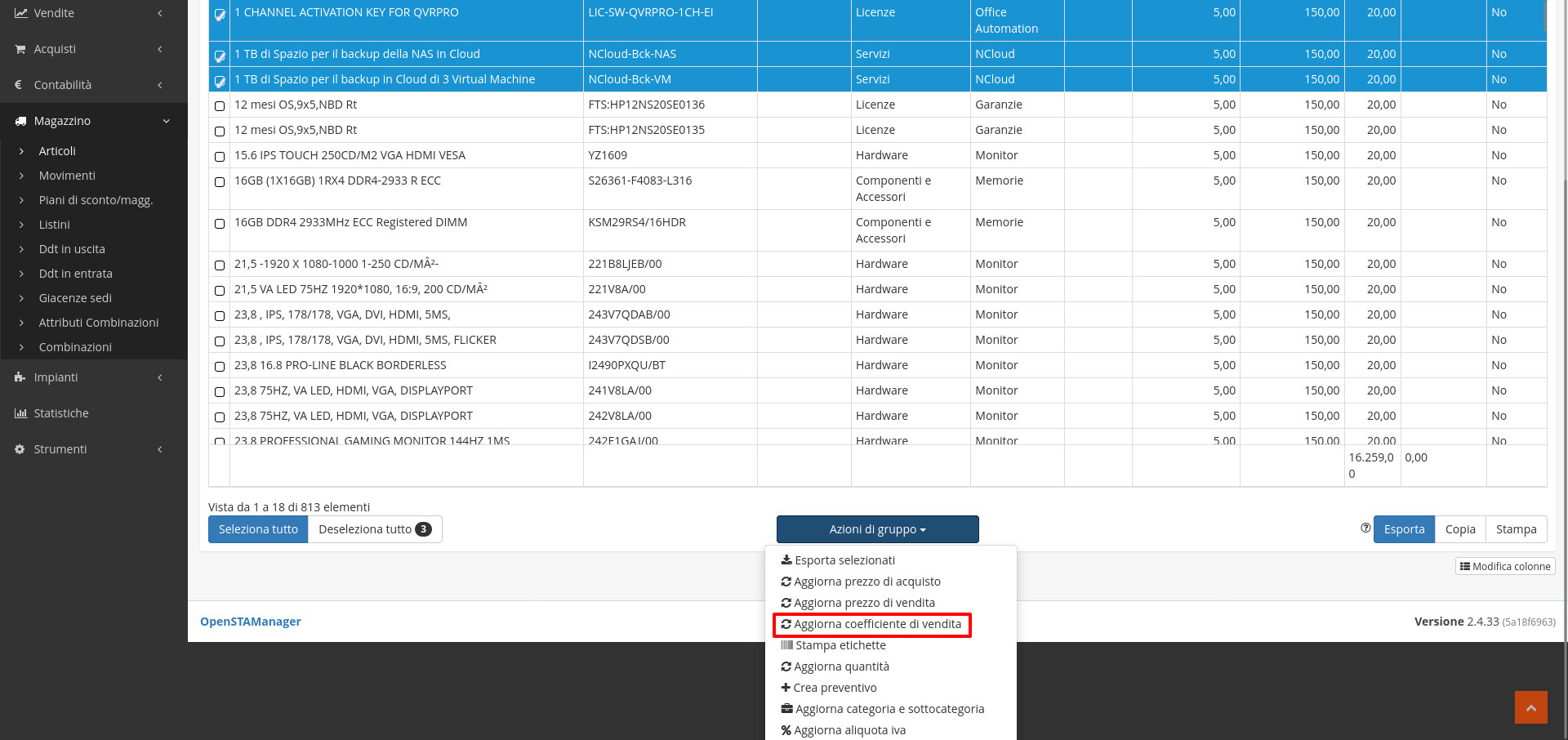Una volta selezionati i record interessati è possibile modificarne massivamente il coefficiente di vendita cliccando su Azioni di gruppo/Aggiorna coefficiente di vendita.