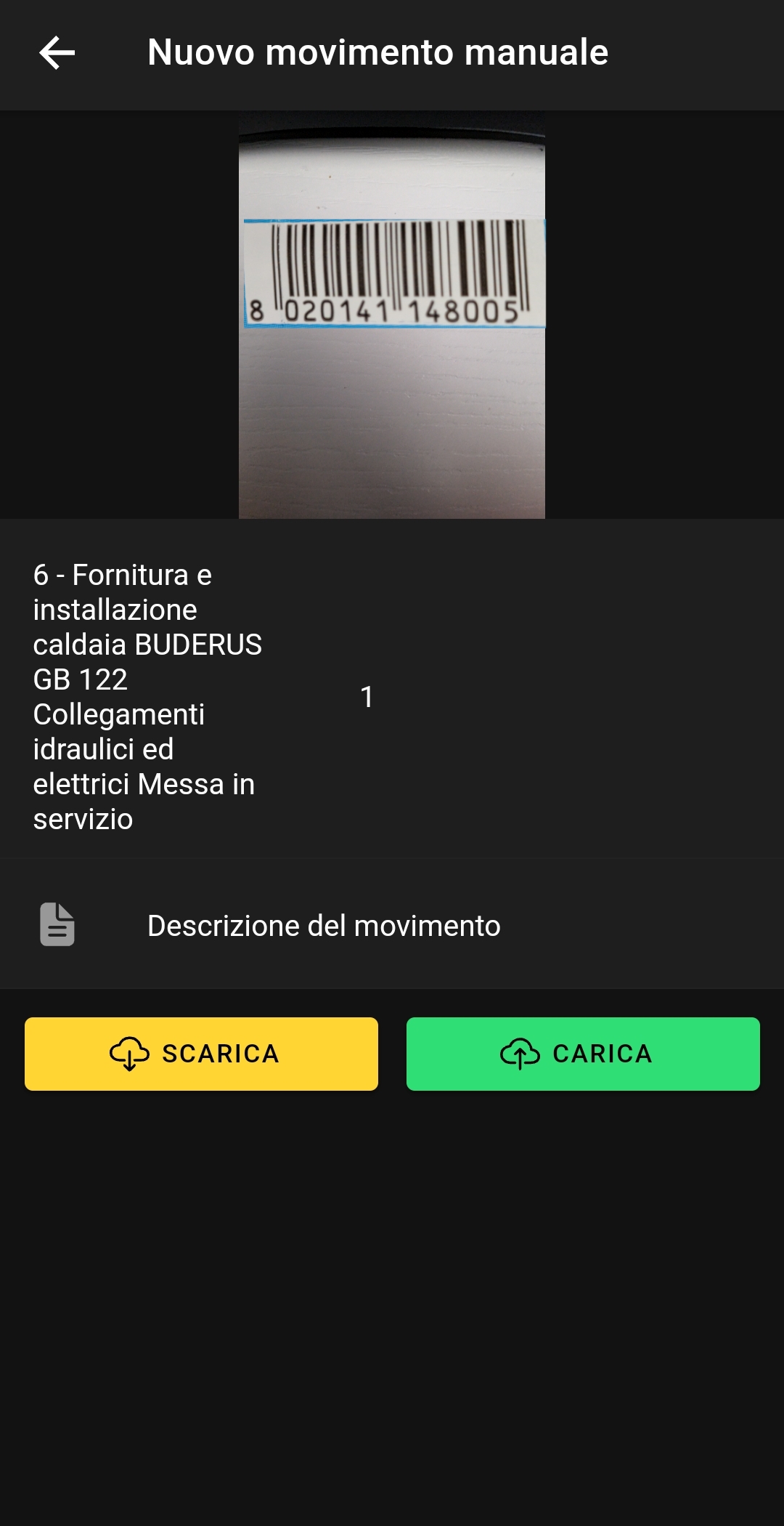 Quando il barcode verrà rilevato, sarà possibile scegliere se effettuare un carico o uno scarico dal magazzino