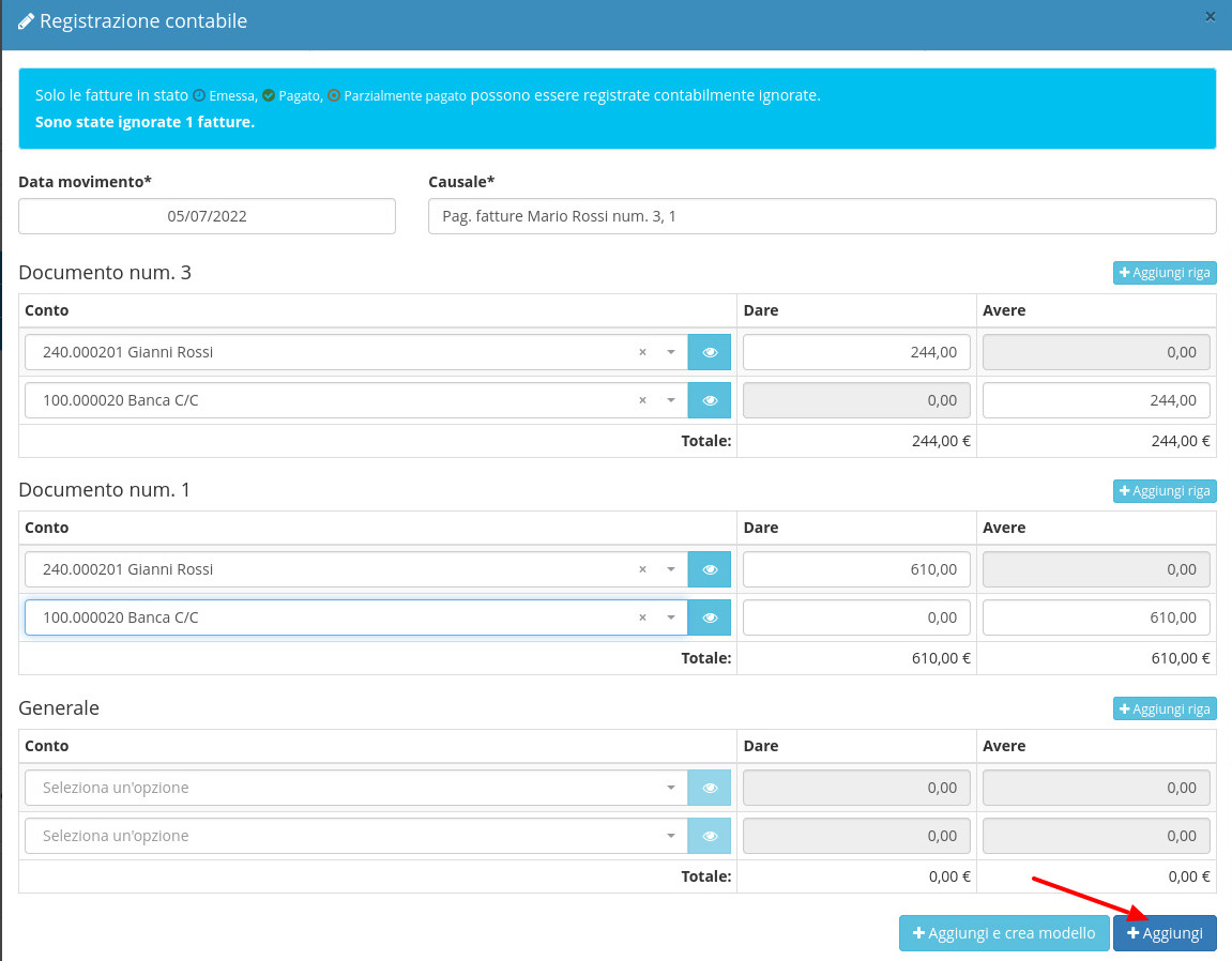 Il gestionale proporrà ora le scritture relative ai pagamenti delle fatture selezionate, cliccando su Aggiungi si procede alla registrazione delle scritture.