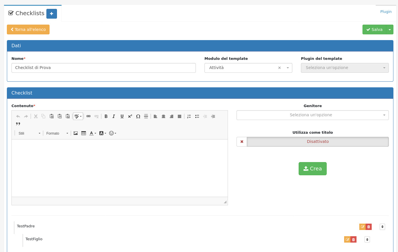 Il modulo **Checklists** permette di aggiungere e modificare le checklists da utilizzare nel plugin Checklist.