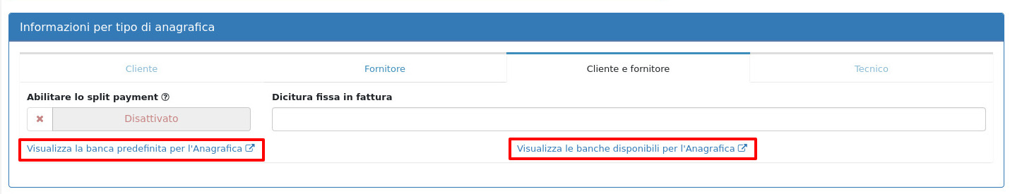 • Le banche disponibili per l'anagrafica.