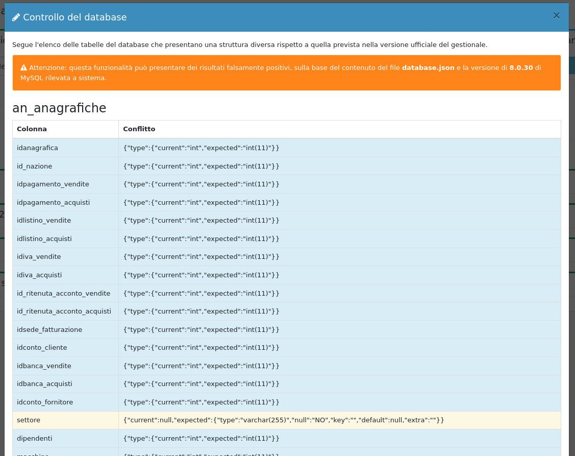 Questa funzionalità può presentare dei risultati falsamente positivi, sulla base del contenuto del file database.json o nel caso di aggiornamento del database alla versione 8.0.30 di MySQL.