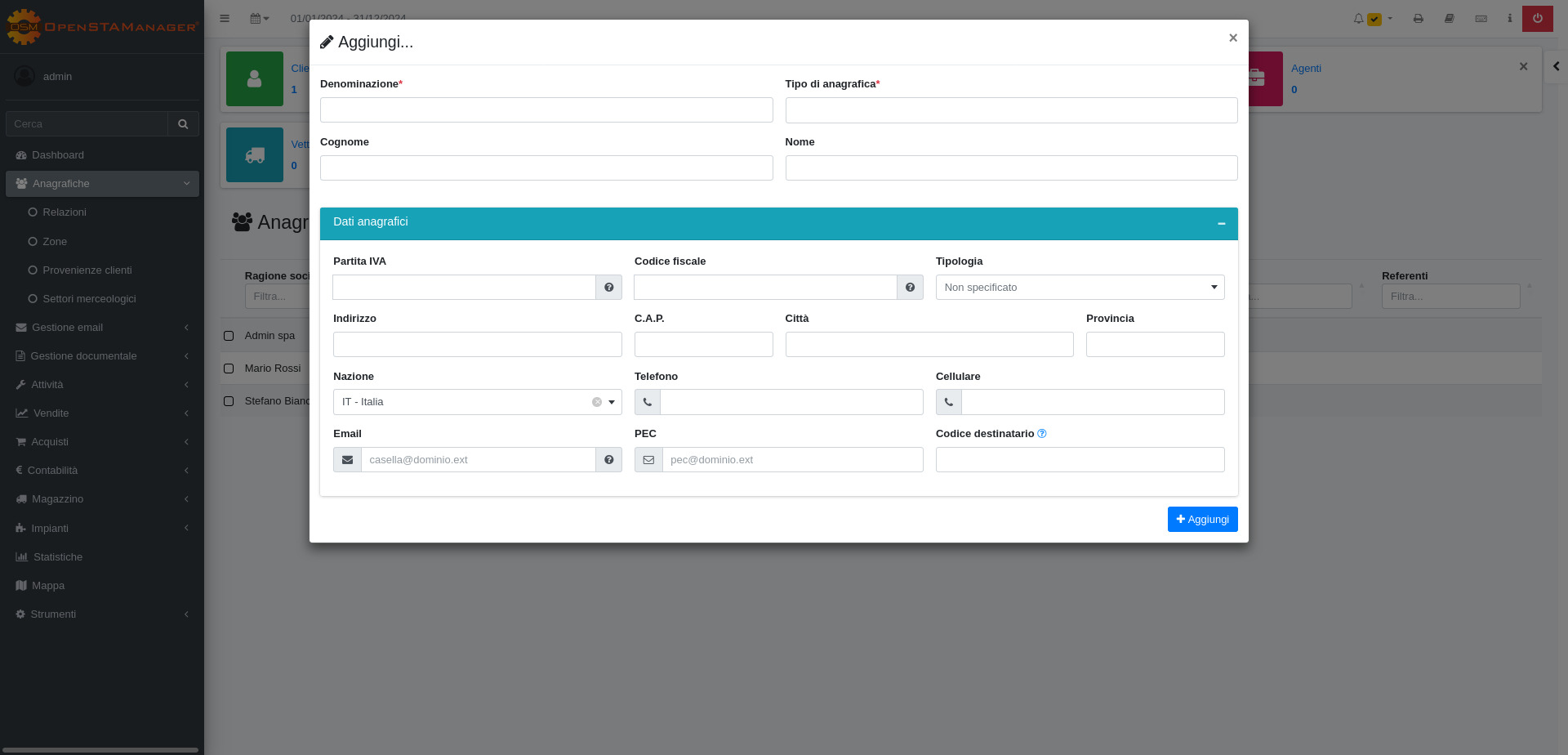 E' possibile aggiungere maggiori informazioni espandendo la sezione **Dati anagrafici**. Qui è possibile procedere all'inserimento di *Partita IVA*, *Codice Fiscale*, e della maggior parte delle informazioni relative alla sede legale e alle opzioni di contatto dell'anagrafica.